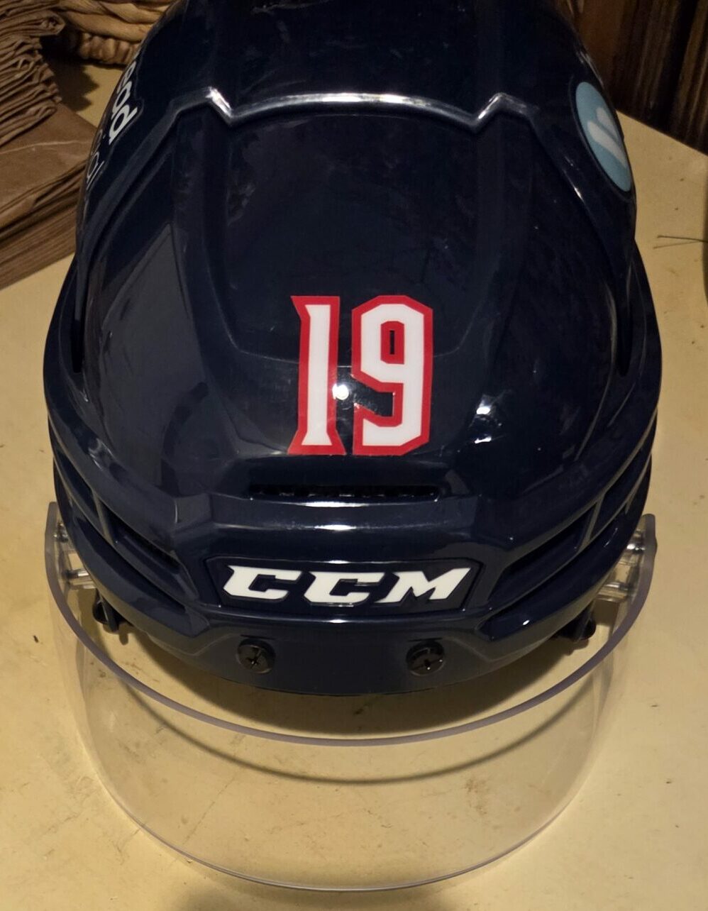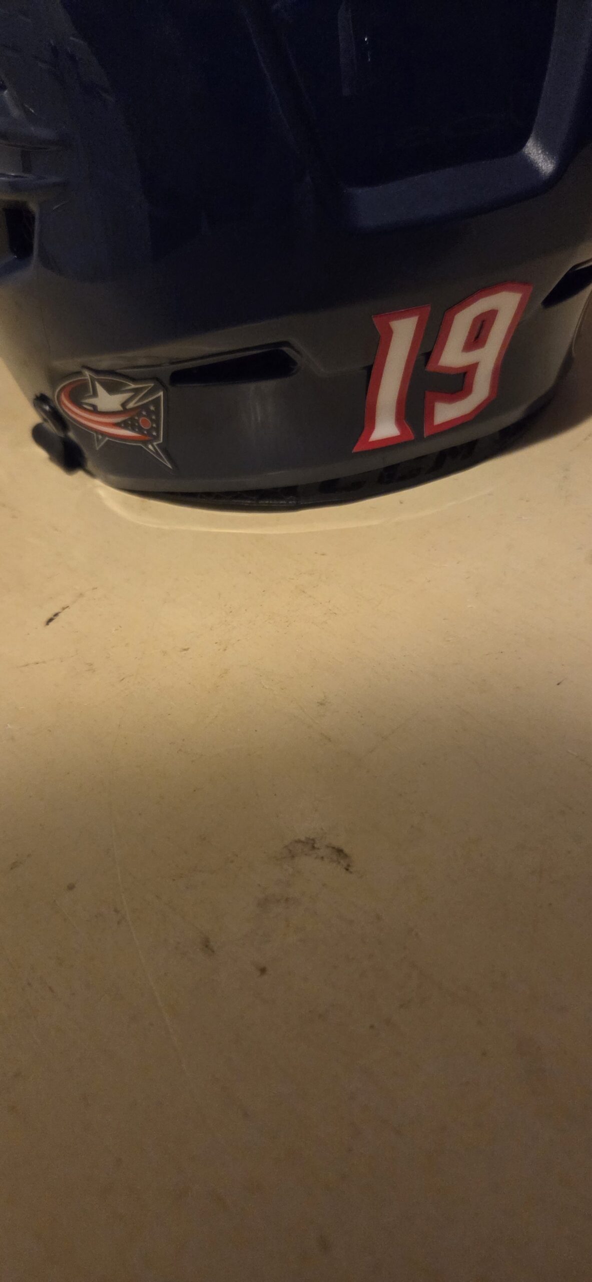 COLUMBUS BLUE JACKETS Liam Forty #19 Blue Bauer Helmet with shield Bread Financial patches $250 red and white numbers